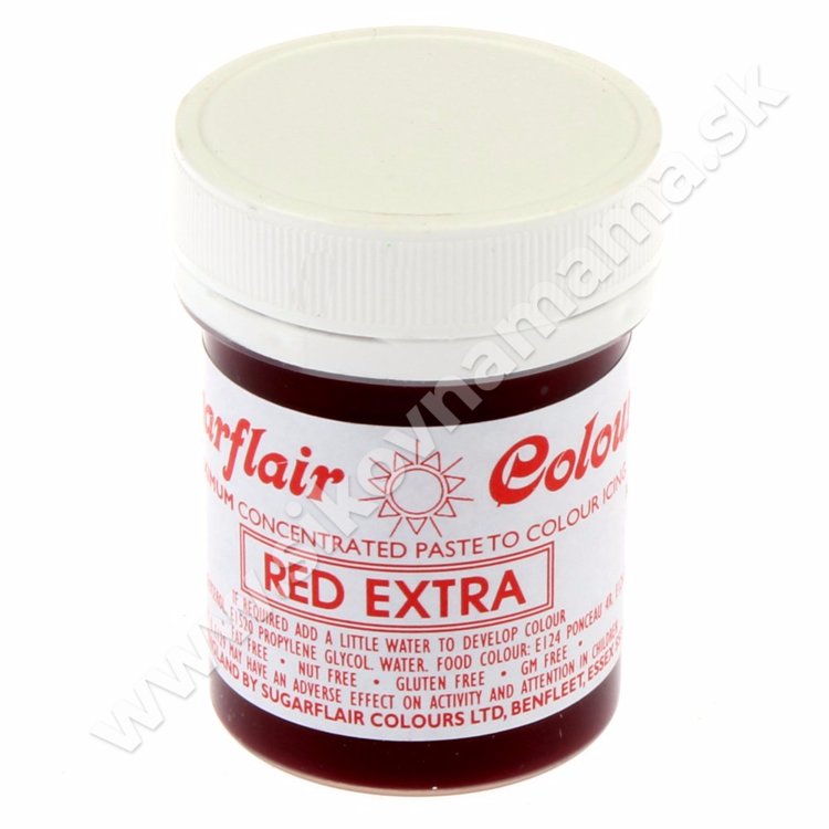 Najkoncentrovanejšia červená gélová farba. Vďaka tejto farbe dosiahnete krásny, sýty, krvavo červený odtieň. Vhodná na farbenie cukrových hmôt, marcipánu, kráľovskej glazúry, maslových krémov...