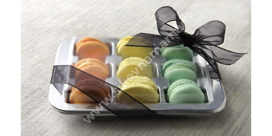 Strieborná plastová krabička s priesvitným vrchnákom na 9ks makróniek. Vo vnútri krabičky sú praktické priehradky, ktoré oddeľujú každú makrónku tak, aby sa zabránilo poškodeniu pri nosení a preprave.