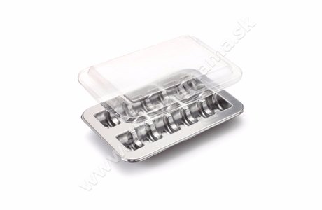Strieborná plastová krabička s priesvitným vrchnákom na 12ks makróniek. Vo vnútri krabičky sú praktické priehradky, ktoré oddeľujú každú makrónku tak, aby sa zabránilo poškodeniu pri nosení a preprave.