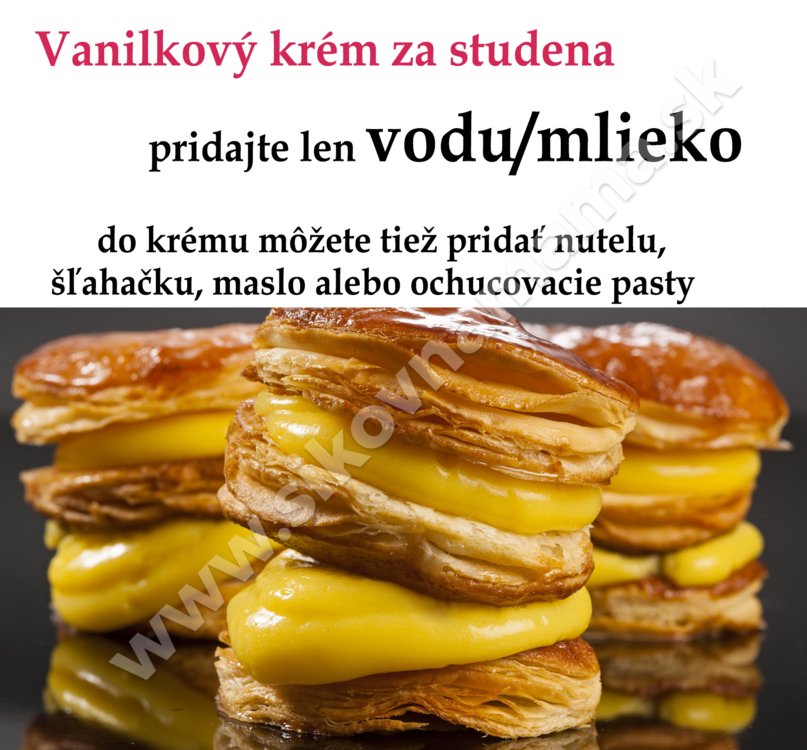 Hotová zmes na prípravu vanilkového krému. Krém je žiarivo žltý, krémový s príjemnou chuťou. Krém je termostabilný, vhodný aj na mrazenie či pečenie. Zachováva si svoju štruktúru, nemení farbu a na jeho povrchu sa nevytvára suchá škrupina a ani sa na ňom nezráža voda.