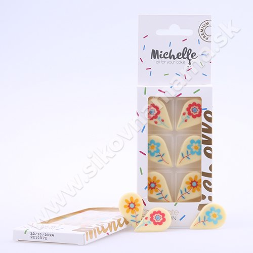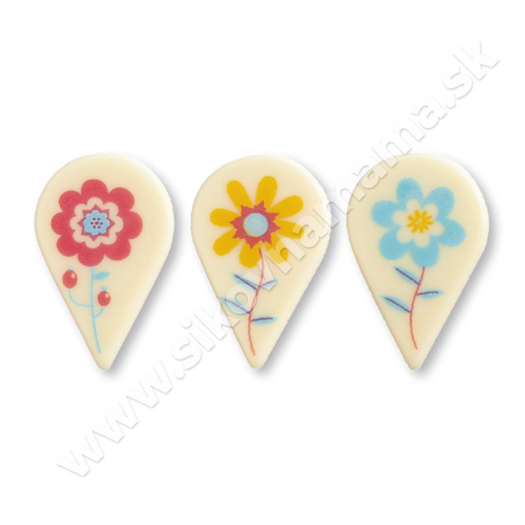 Lahodné čokoládové kvety z bielej čokolády s farebnou potlačou ako elegantná a moderná dekorácia na zákusky a torty.