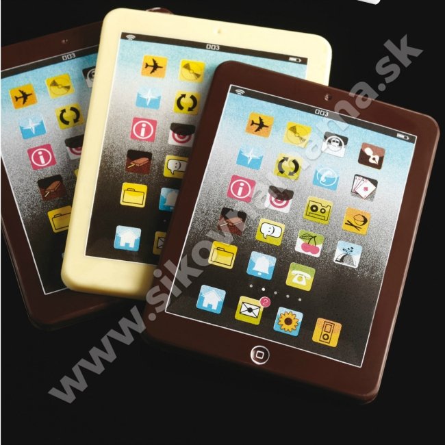 Postup prípravy: stačí naliať bielu čokoládu do čokotransférovej formy, nechať stuhnúť a výsledkom je krásny realistický tablet s farebným displejom z čokolády.