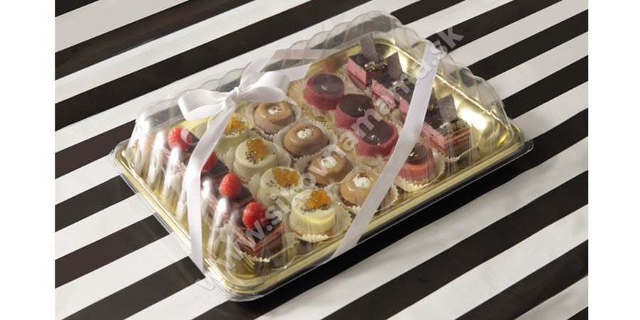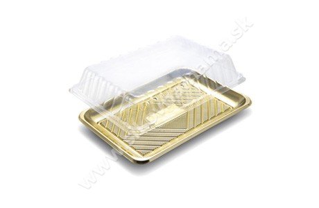 Zlatá plastová podložka s priesvitným vrchnákom vhodná na zabalenie Vašich zákuskov, sušienok alebo rolád. Výborná na výslužku.